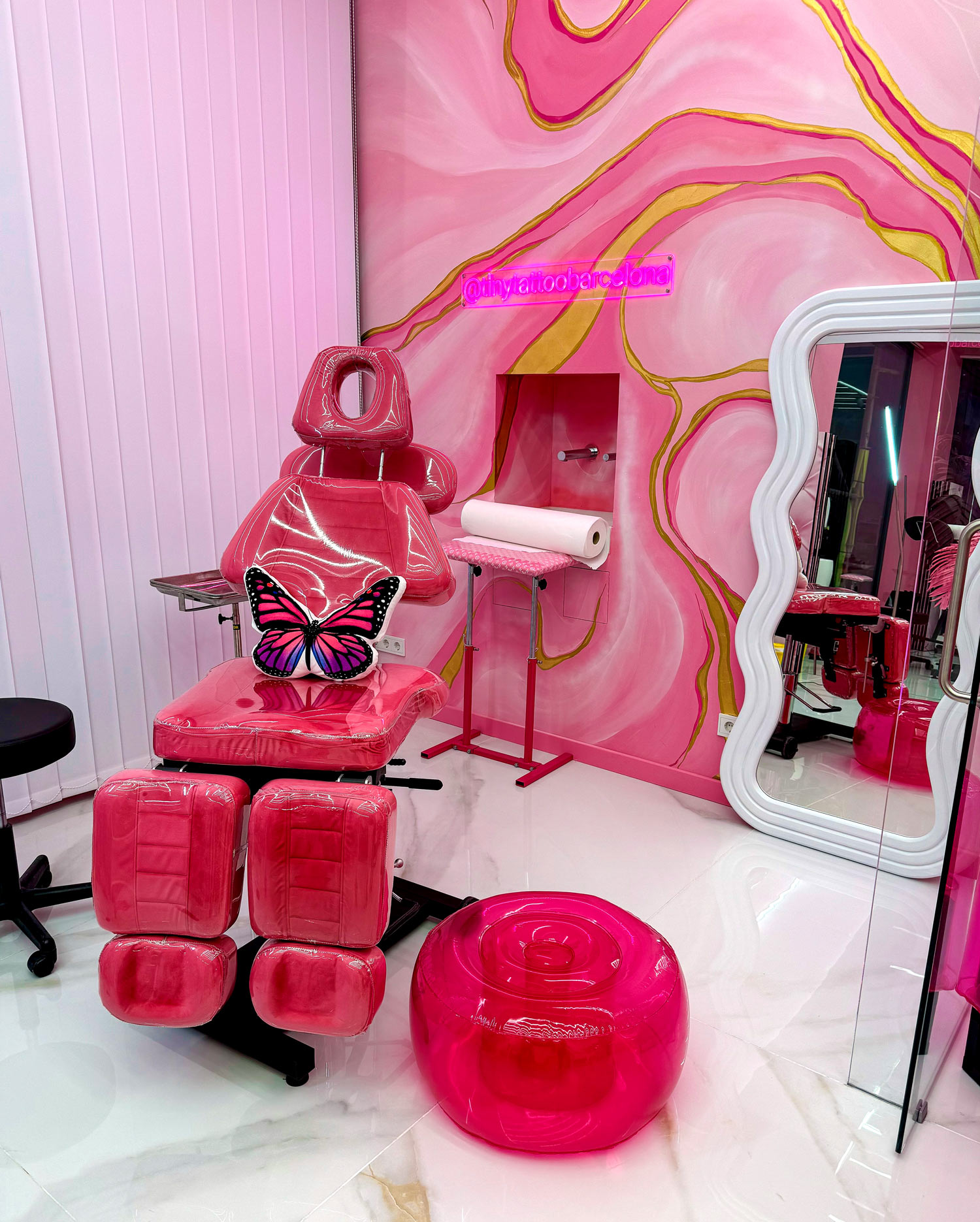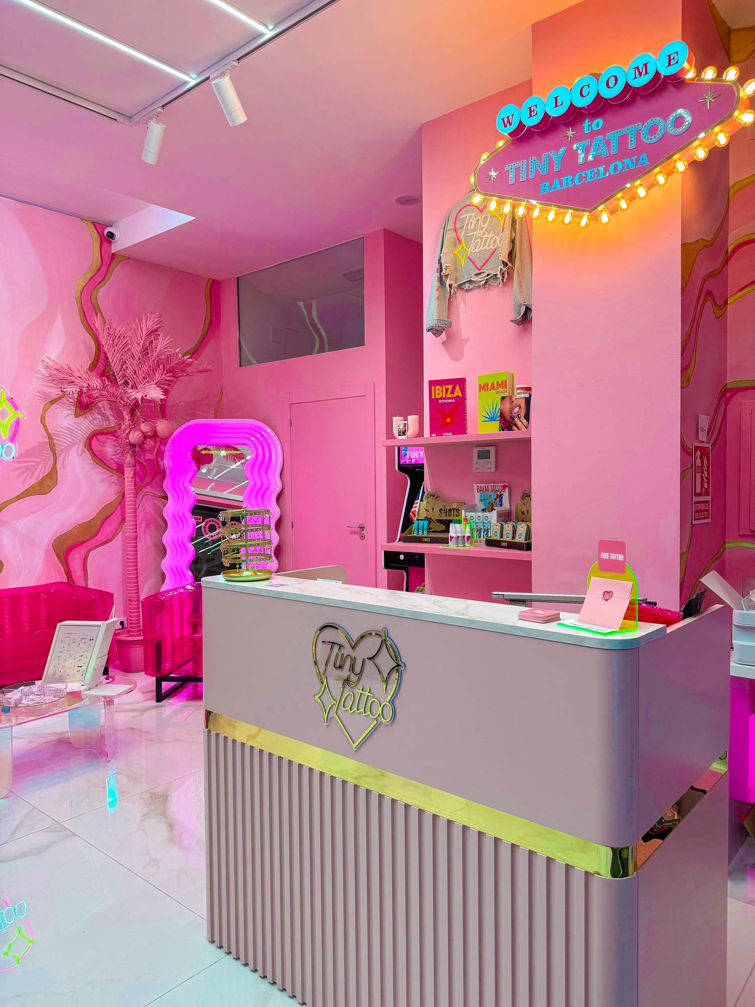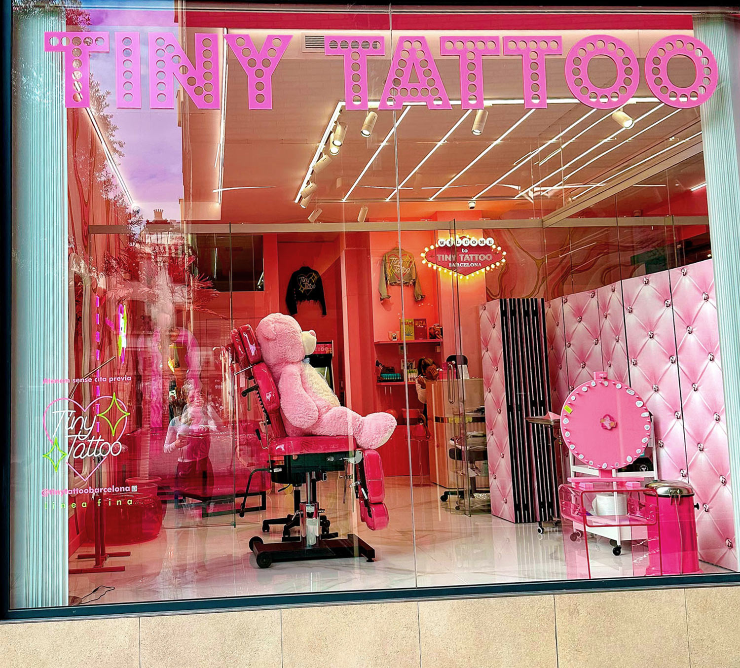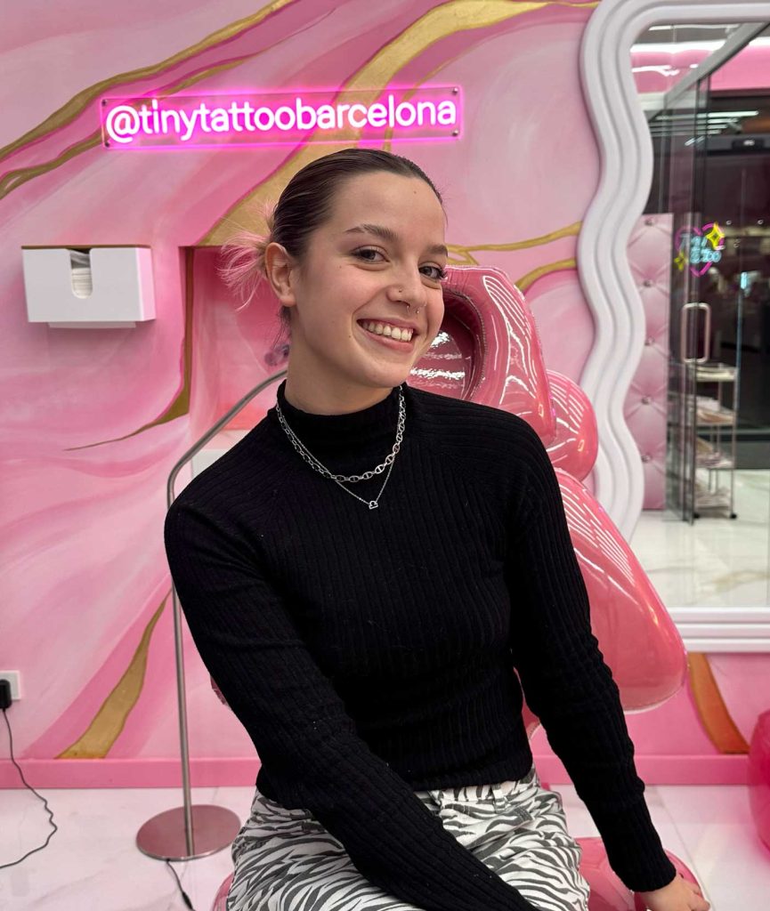 In the pedestrian heart of Granollers, a splash of pink contrasts with the modernist stone and invites you in. Retro arcade, micro-flash wall, and tufted armchairs set the mood, while our fine line artists bring your story to life—whether it’s a letter, an icon, or the silhouette of Montseny—with millimeter precision and hospital-grade sterilization. Walk-ins are welcome, or book online to secure your pink moment.